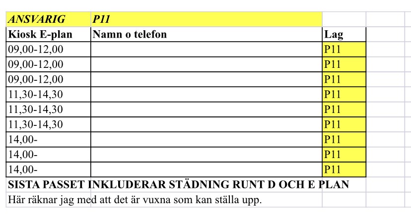 Hej pÄ er Nu Àr det klart att förÀldrar för p-11 ska stÄ i kiosken mellan stora o lilla konstgrÀsplanen (lilla gula runda huset) pÄ klassfotbollen den 14maj! Tiderna finns pÄ den bifogade bilden, men jag skriver de Àven hÀr: 3st förÀldrar kl 09.00-12.00 3st förÀldrar kl11.30-14.30 3st förÀldrar 14.00- slut... (sista passet inkluderar Àven lite stÀd runt omkring de bÄda konstgrÀsplanerna! SÄ anmÀl er via sms till Stina (tel: 0730-266042) vilket pass ni skulle kunna tÀnka er att stÀlla upp pÄ, sÄ fördelar vi ledare sedan passen emellan er, och Äterkommer med vilka det blir! Tack pÄ förhand! //Ledarna