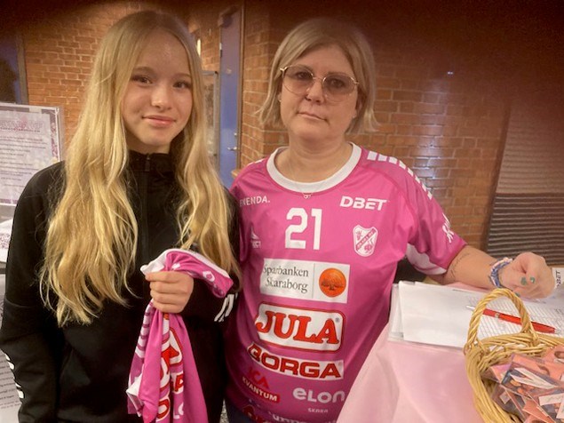 14-åriga Skara HF-spelaren Alice Rydberg köpte en av de rosa tröjorna som HF-spelarna har haft på sig under oktobermatcherna. På bilden är hon tillsammans med Jenny Andersson som sålde tröjorna i samband med onsdagens seriematch mot Hallby. Rosa bandetkampanjen för Skara HF:s del har bland annat inneburit rosa spelare under seriematcherna i oktober. Nu är månaden och kampanjen slut. På onsdagen lämnades tröjorna ut till försäljning och det blev en lysande åtgång på dem. Bleonas tröja Varje tröja kostade 350 kr som oavkortat går till Bröstcancerfonden. Redan i matchens halvtid var alla spelarnas tröjor sålda. Alice Rydberg köpte Bleona Nuredinis tröja. Hon berättar varför: -Jag tycker dom rosa tröjorna är så fina. Själv spelar jag i Skara HF på samma position som Bleona som är en av mina favoriter. Hon har dessutom samma tröjnummer som jag har på min fotbollströja. Rykande åtgång Jenny Andersson, som sålde tröjorna i rosa bandetshopen, kunde konstatera att det gick snabbt att bli av med spelarnas tröjor: -Nu finns det bara några tröjor kvar, en del utan nummer och några med nummer som inga spelare har.. Några kvar på söndag? De som köpt tröjor kommer kunna hämta dem i foajén i samband med söndagens cupmatch mot IK Sävehof. Den som vill ha någon av de kvarvarande tröjorna kan kontakta HF:s kansli eller kolla om någon finns kvar i samband med den där viktiga cupmatchen mot IK Sävehpf på söndag. -Detta blev ett väldigt bra och viktigt ekonomiskt bidrag till Rosa bandetkampanjen. säger sportchef Gunilla Flink som också lovar att tröjorna på söndag kommer levereras nytvättade efter att spelarna tagit av sig dem för sista gången. PS glöm inte komma i tid till den avgörande cupmatchen och reprisen på SM-finalen med avkast på söndag klockan 16.00!!!! Text och bild: Annika Andersson