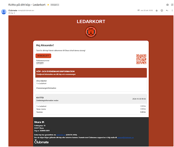Ämnesraden kommer vara "Kvitto på ditt köp - Ledarkort" och i det mailet kommer er