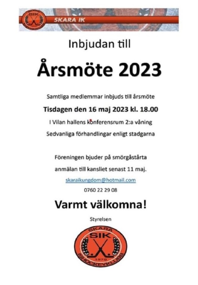 Hejsan ! Tänk vad tiden går fort. Kändes som igår när vi gick in i ishallen för att starta upp säsongens träningar och nu är det redan slut. För er som ska vara med på årets sommarhockey kan utrustningen vara kvar i boden övriga behöver hämta ut sin utrustning. För att komma in i boden och hämta utrustningen så kotakta mig så fixar vi det. Här kommer även inbjudan till årsmötet. OBS! Glöm inte att anmäla er till kansliet: skaraikungdom@hotmail.com senast 11 maj. Ha en underbar sommar och ta hand om er så ses vi i höst igen! U14 (-11/-12) 17 apr 2023 0kommentarer