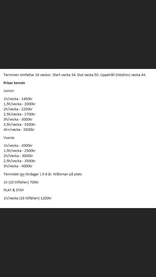 Tjena klubben! 🎾 Vi närmar oss höst-terminen med stormsteg! Vi siktar på att kicka igång 23/8. Jag pusslar med grupperna i detta nu. Väntar in ett par av barnens skol-scheman för att få ihop pusslet. Men, vi ska såklart ha lite aktiviteter nästa vecka! Tisdag: Drop in Vuxen. 18.00-20.00. Pris 200kr. Anmälan till Erik. Fredag: Juniorkväll 17.00-21.00 med tennislekar och pizza. Alla juniorer välkomna. Pris 200kr. Anmälan till Erik. Vid frågor, bergmanerik@hotmail.com