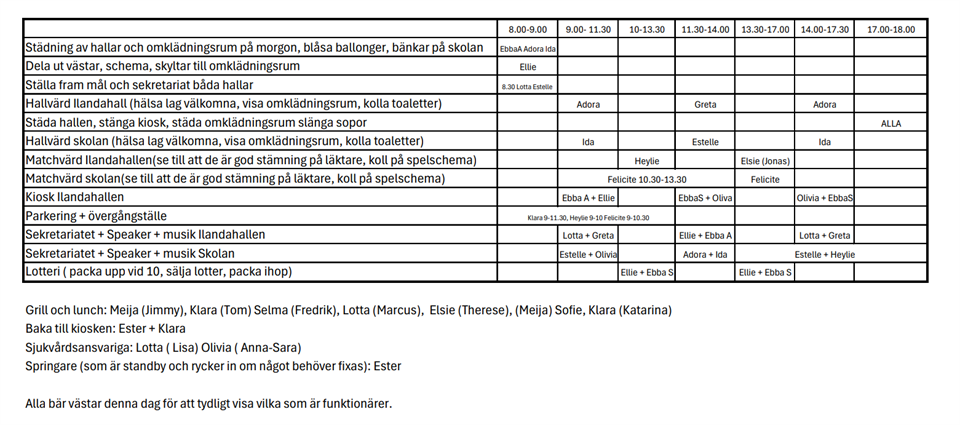 Nu har vi i planeringsgruppen haft vårt tredje möte och kommit fram till ett förslag på fördelning av arbetsuppgifter den 15/9. Vi hoppas att det ska fungera för er alla och vill man byta pass med någon går det alldeles utmärkt så länge man styr upp det på egen hand.