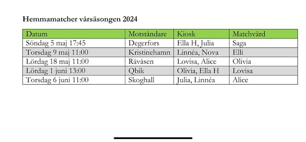 Bilden visar våra hemmamatcher under våren samt vilken/vilka matcher ni bemannar kiosk/matchvärd.