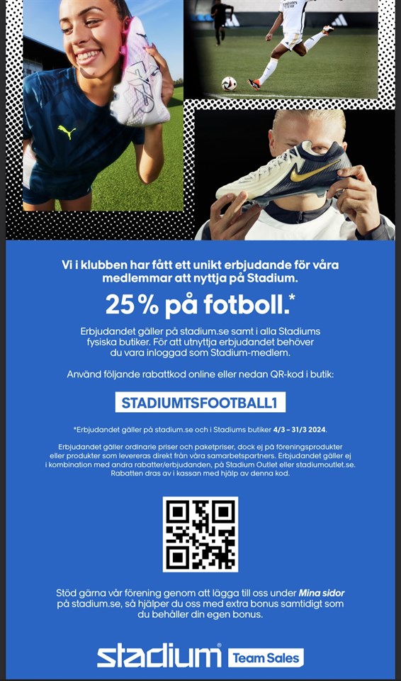 Hejsan! Här kommer ett erbjudande från Stadium till alla våra medlemmar! Kika in om ni skulle behöva fylla på inför utomhussäsongen. Se rabattkod i bilden ovan.
