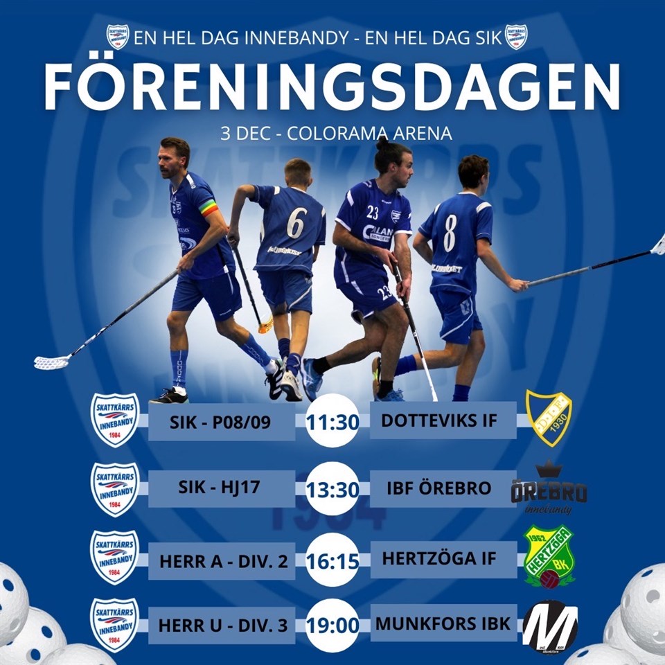 Boka in söndag 3 december i era kalendrar för då är det föreningsdag för alla medlemmar med familjer i Skattkärrs innebandy. Det kommer att vara fyra hemmamatcher för olika Skattkärrslag under hela dagen i Colorama arena i Karlstads innebandyhallar, se bifogad bild. Självklart vill vi fylla läktarna under så många matcher som möjligt. I pausen på Herr A matchen kommer vi att dra vinnaren av vårt 50/50 lotteri som pågår i våra socialamedier, vi kommer också att få anjnuta matchspel från flickor födda 15/16. Det kommer bl.a. att finnas hamburgerförsäljning, lotterier, speedshooting och premiärförsäljning av klubbens nya mössor. Så nu hoppas vi att så många som möjligt av er har möjlighet att åka in före eller efter vår träning. För mer info följ gärna våra sociala medier på Facebook eller instagram och glöm inte att köpa dig en eller helst flera 50/50 lotter! Vi ses, hälsningar ledare och styrelsen!