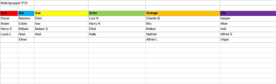 För att underlätta lite vid kallning till matcher har vi delat in grabbarna i 6 olika grupper, 3 grupper kommer kallas till varje match. Kommer även använda dessa grupper för de jobb som ska göras på matcherna(fikaförsäljning/bakning och sekretariat), så håll koll på vilken färg ni är. Grupperna ser ut såhär. P-12 11 nov 2021 2kommentarer