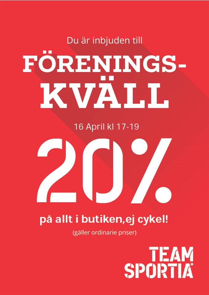 Klubbkväll på Team Sportia Kungsfors i Skene Tisdag 16 april 17.00-19.00 Skene IF Klubbshop 17.00 Fotbollsskola, F-15/16 17.15 P-16, P-15, P-14 17.30 P-13, P-12 17.45 F-12/13, P-10, P-11 18.00 F-09, F-11 18.15 P-09, P-08 18.30 Senior, U19 Tiderna är för att sprida ut det så inte alla kommer samtidigt, men ändå inget krav. Funkar en annan tid bättre så är ni självklart välkomna. 20% rabatt på allt i butiken (ej cykel). Alla medlemmar är hjärtligt välkomna!