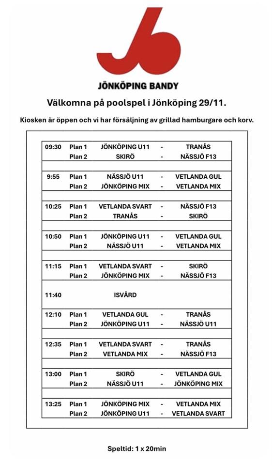 På lördag 29/11 är vi inbjudna till poolspel i U11, Jönköping-Råslätt.