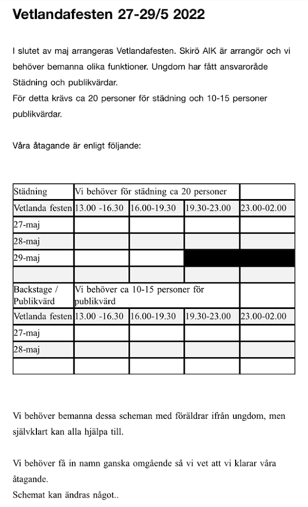 Ronny och Elsa kan vara publikvärdar Fredag 27e 16.00-19.30.