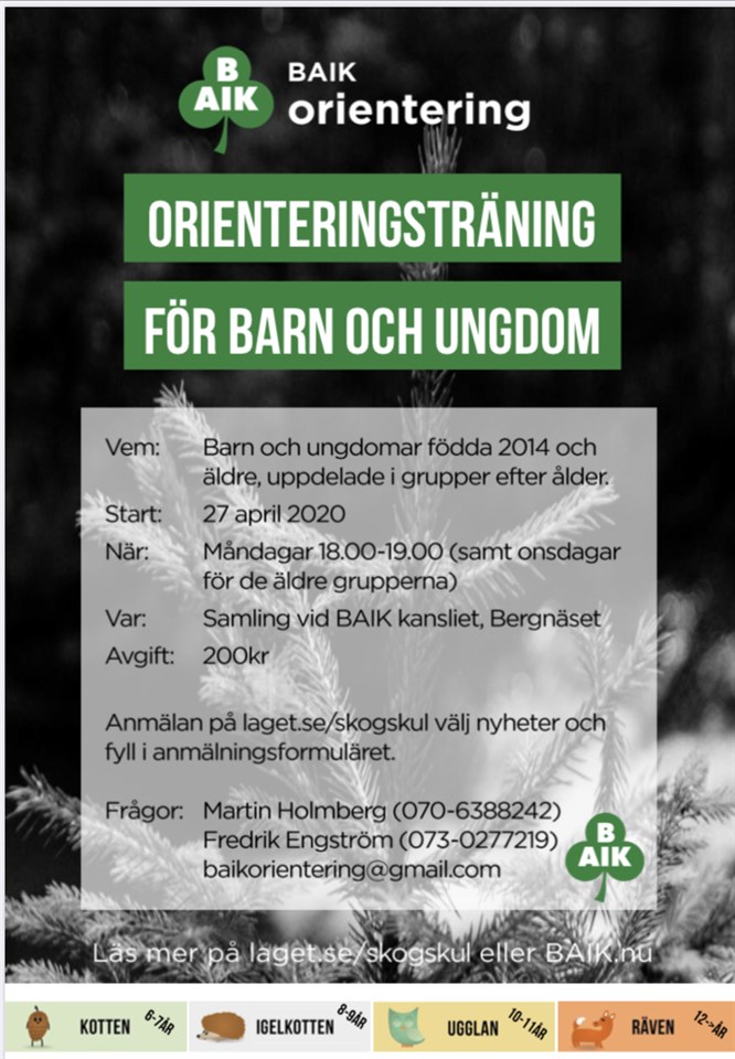 Hej, nu närmar sig Orienteringssäsongen med fart. Vi kör igång träning för våra barn och ungdomsgrupper 27 April för barn födda 2014 och äldre. Nya barn och ungdomar anmäler sig via Anmälningsformulär Välkomna! /Ledarna - Bergnäsets AIK Orientering PS. Även nya ledare är välkomna inför uppstart, Anmäl via formuläret ovan. Inbjudan Kotten 6-7år 30 mar 2020 1kommentar