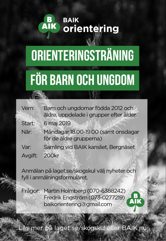 Äntligen börjar marken titta fram igen och då är det dags att damma av orienteringsskorna! Den 6 maj kör vi igång med skogskul och barn-/ungdoms träning (barn 2012 och äldre). Vi tränar som vanligt måndagar kl 18-19, oftast med BAIKs kansli som startpunkt (annars skriver vi det i förväg). Det äldsta gänget födda 2006-2008 kommer även att träna på onsdagar kl 18-19 med Oskar Öqvist, som är elitorienterare! För de som redan varit med oss förra säsongen tjuvstartar vi med en öppen träning 25 april. Gammelstads IFs sprintcup, som brukar vara en höjdpunkt för barn och ungdomar, blir 29April, 2 maj och 12 maj så därför startar vi lite tidigare. Anmälan kan redan nu göras via följande formulär Vi ses i skogen! Kotten 6-7år 22 apr 2019 0kommentarer