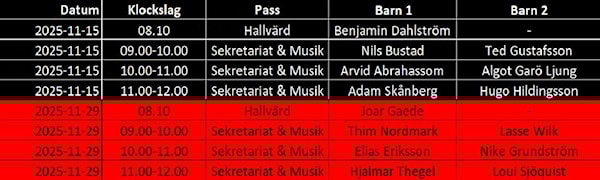 I bilden ovan finner ni en fördelning av uppgifter över lagets hemmamatcher denna höst, både för lag Svart (15nov) och Röd (29 nov). Vi kommer att bemanna sekretariatet under tre timmar samt se till att en hallvärd finns på plats i syfte att bland annat välkomna motståndarlagen och exempelvis visa dem till rätt omklädningsrum.