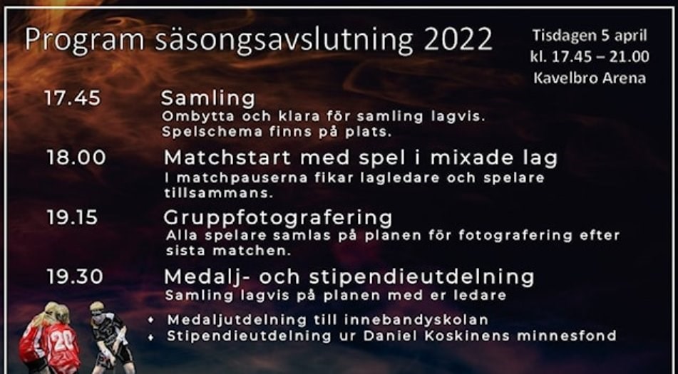 Vi har verkligen saknat vår fina föreningsavslutning, men tisdag 5 april är det äntligen dags igen! Vi samlar hela Sibben i en härlig aktivitet med spel i åldersmixade lag, utdelning av medaljer till innebandyskolan och stipendieutdelning från Daniel Koskinens minnesfond. Anmälan (för spelare) sker via denna länk senast 30 mars! En gammal, mycket uppskattad tradition är en kakbuffé på avslutningskvällen, så det behövs 2-5 personer per lag som bakar något gott. Vill fler baka så gör det ingenting. Alla spelare bjuds även på korv och festis. Välkomna! Styrelsen Pojkar 2010 19 mar 2022 0kommentarer