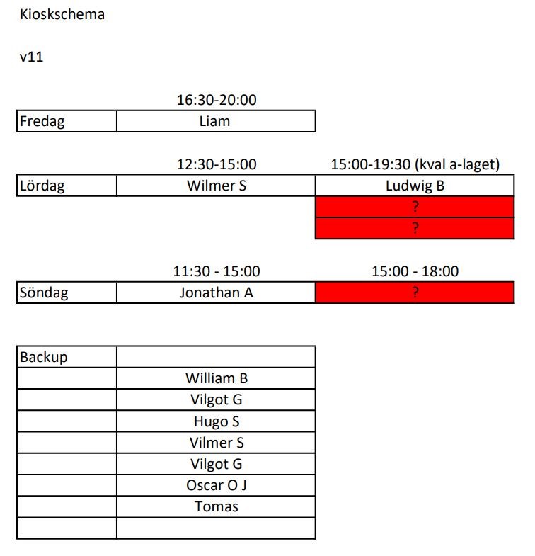 Här kommer schema v 11 för kiosk. Dom 3(!) röda passen behöver bemannas av några som står som backup som ni ser under schemat, först till kvarn :) Dessa tider MÅSTE bemannas då det är matchaktivitet i hallen. Ni hittar även schemat under dokument "kiosk v 11" (uppdaterar när samtliga pass är bemannade) Pojkar 2011/2012 13 mar 2023 19kommentarer