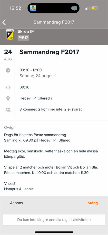 Hej! F2017 spelar sammandrag imorgon i Ullared, samling 09:30. De har lite bortfall pga sjukdom och behöver låna flickor av F2018. Skriv en kommentar om ni har intresse. Se även mer info i bifogad bild. P18 23 aug 1kommentar