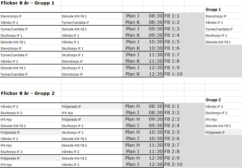 Hej Tänk på att ha med kläder efter väder som barnen kan ha på sig mellan matcherna. Ta även med lite mellanmål så att vi håller energin uppe hela förmiddagen. Kom ombytta med svarta shorts, svarta strumpor, benskydd och fotbollskor. Matchtröjor får ni på plats. Det kommer finnas lite "fri tid" mellan matcherna. Vi hoppas på en härlig förmiddag och full fart på matchplanerna. Se nedan för lagindelning och vilken samlingstid som gäller respektive lag. Lag 1 Samling 9.00 (kom gärna en halvtimme tidigare och stötta lag 2 i deras första match) Livia Stella L Bianca Tuva Moa GS Ylva Tindra Belise Alma B Melinda Matcher 9.30 Våmb 10.30 Stenstorp 11.30 Tymer/Lerdala 12.30 Skövde KIK Lag 2 Samling 8.00 (Stanna gärna kvar efter sista matchen och stötta lag 1 i deras sista match) Ophelia Elsa Imber Tilde Stella S Saga Moa A Somra Alva Elvira Alma T Matcher 8.30 Hjo 9.30 Skövde KIK 10.30 Fröjered 11.30 Våmb Väl mött på Orkanvallen 😊