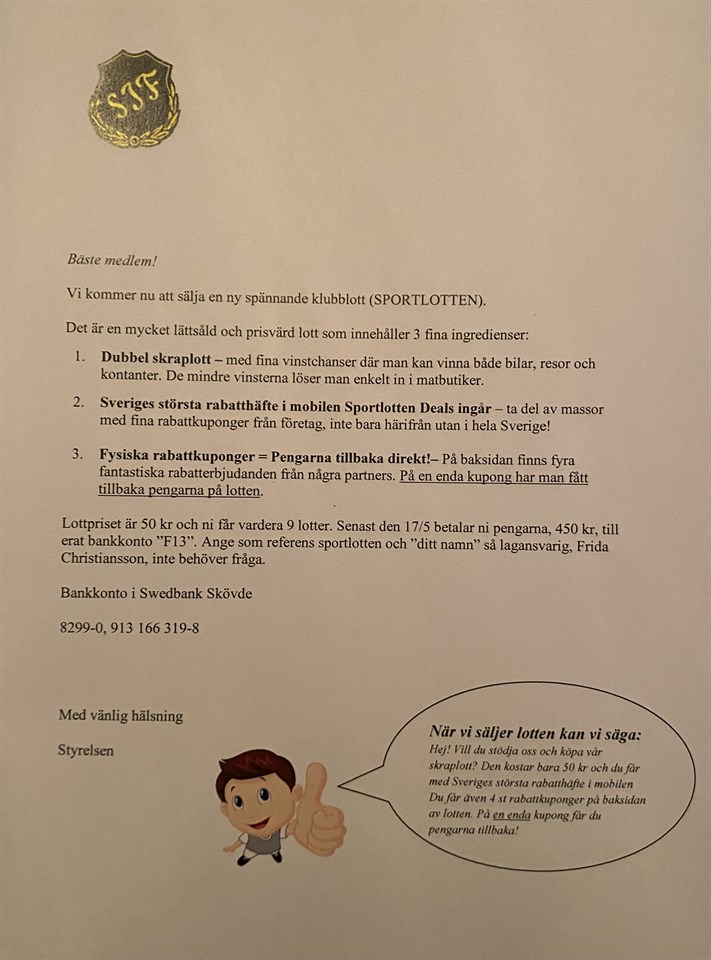 Hej! Under våren ska alla spelare sälja 9 st sportlotter vardera. Om man vill finns det möjlighet att hämta dessa lotter hemma hos mig på Visthusvägen 18 nu på lördag 23/3 kl 10-11. Kommentera gärna detta inlägg om ni planerar att komma förbi. Vill man inte hämta då så delar jag ut dem i samband med vår Kick-off 7/4. Se bild för mer info kring lotten och betalning. Mvh Frida F-13 21 mar 2024 5kommentarer