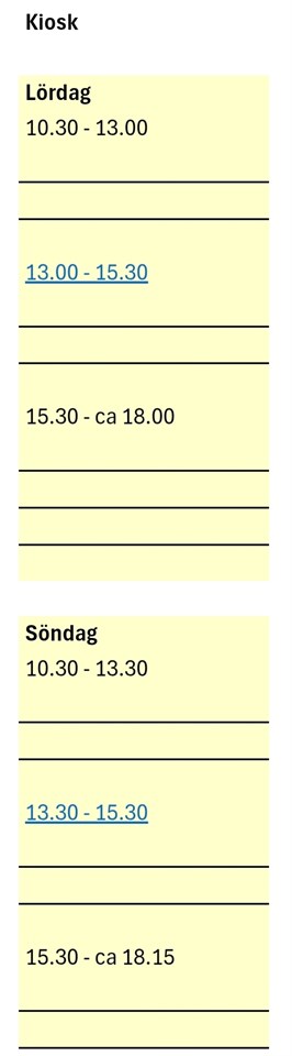 RapporteraFörlåt, missade lite info! Alla kioskpass är man 2 st, förutom den sista på lördagen då det är herrmatch. Då är man 2 i kiosken och 1 som har inträde. Då är grabbarna dessutom bollkallar, så dom 3 som har kioskpasset den tiden får hjälpa grabbarna om det är något😊 Även att få kontakt med laget som har match, för att få sina västar.