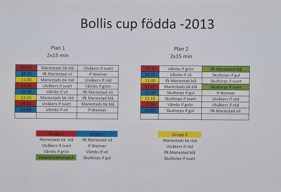 Hej. Jag kommer att publicera spelschemat för Bollis Cup på supertext och om det är någon som inte kan se det så hör av er så skickar jag det via sms. Boda lagen spelar sin första match 10.15 på lördag så jag tänker att vi samlas på Vänershof kl 09:00 vid den stora läktaren. Vi kommer att spela med dom lagen som vi att ihop för seriespel. Vid frågor så ring eller hör ev er via supertext.