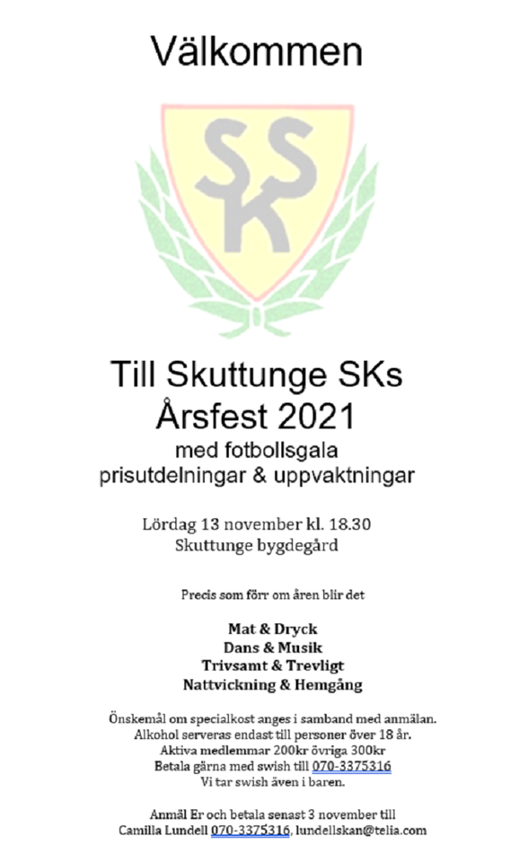 Äntligen dags för årets Skuttungefest. Se till att anmäla er och vara med och fira årets säsong. Det blir prat, analyser, priser, fotbollsgala, dans och fest. Anmäl er till Camilla Lundell på 070-337 53 16 eller lundellskan@telia.com