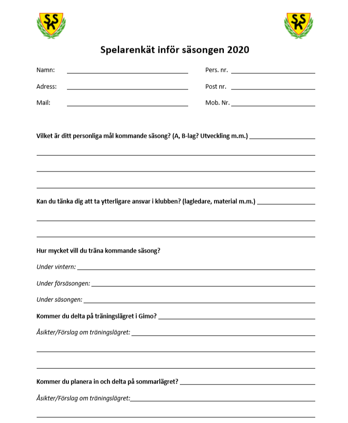 Spelarenkäten lyser med sin frånvaro från ett antal spelare. Se till att ta med den ifylld och klar till träningen idag och ge den till mig. Om ni inte har den finns den under dokument här på laget.se Jag lägger även upp de på FB som ett Worddokument. Om ni av någon anledning inte har enkäten, inte kan skriva ut den eller inte ens kan ladda ner den och maila den till mig på Henrik@skuttungeby.se så se till att omgående maila mig de viktigaste uppgifterna. Dessa är: För och Efternamn. Personnummer. Adress Telefonnummer Mailadress Syns i kväll! mvh Henrik!