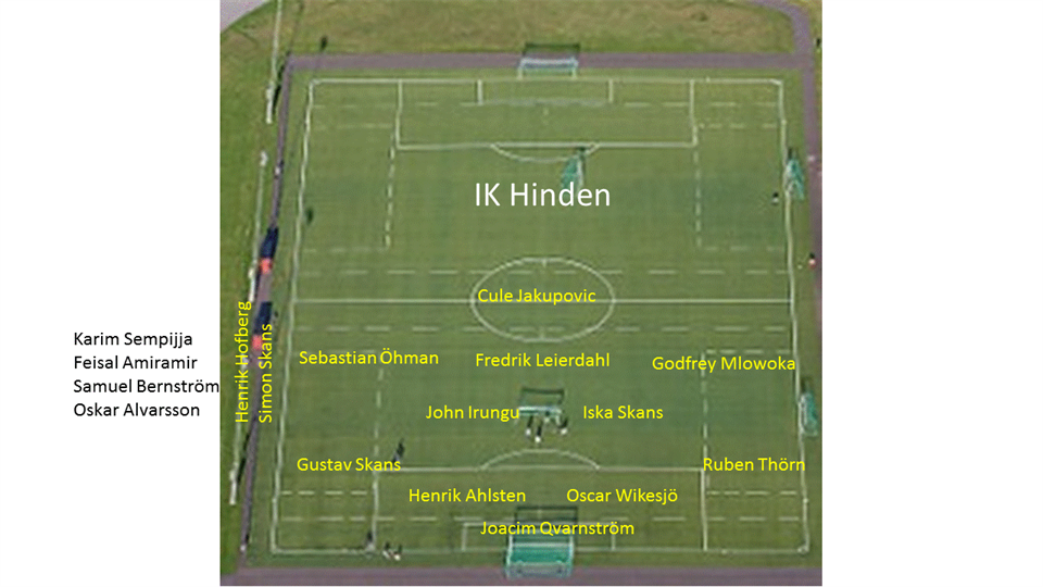 Här kommer laget till kvällens match mot Hinden på Österängens IP klockan 21.00 i Upplandscupen. Målvakt Joacim Övarnström Backlinje Ruben Thörn, Oscar Wikesjö, Henrik Ahlsten och Gustav Skans Mittfält Isak Skans, John Irungu och Fredrik Leierdahl Anfall Godfrey Mlowoka, Cule Jakupovic och Sebastian Öhman Avbytare Karim Sempijja, Feisal Amiramir, Samuel Bernström och Oskar Alvarsson Henrik Hofberg och Simon Skans leder laget.