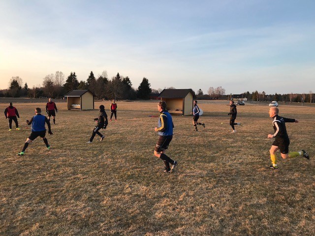 Som förra året så kämpar planskötarna för att ge oss så bra förutsättnignar som möjligt och har sett till att vi redan nu kan gå ut på gärdet och träna. Blev en riktigt rolig träning som höll förvånadsvärt hög klass. Lite lagom kalla vårvindar gör inte så mycket när glädjen är hög och alla spelare är som kalvar på grönbete. Träningens bästa tackling stod Robban för när han "rövtacklar" Fredrik. Han stod nog även för näst bästa när han MMA-brottar ner undertecknad. Som vanligt är reglerna tydliga och rätt högt satta vilket gjorde att det inte ens blev frispark.