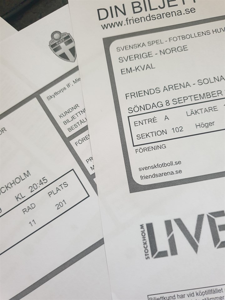 Hej, Det iinns två biljetter kvar till EM-kval-matchen mellan Sverige och Norge. Matchen spelas på Friends Arena söndag 8 september kl 20.45. 125:-/biljetten Till Sverige - Spanien finns det 8 biljetter. Spelas tisdag 15 oktober på Friends. 125:-/biljetten Först till kvarn! P-13 18 aug 2019 0kommentarer