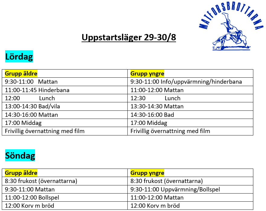 Här kommer en bild med ett preliminärt schema inför helgens uppstartsläger, scrolla om inte hela bilden syns. Vi träffas på hallen kl. 9:30 på lördag. Vi kommer att äta på hockeyn så man behöver ha kläder för att gå emellan, ta även med badkläder samt träningskläder så klart. För dom som ska övernatta behövs något att ligga på, sovsäck/täcke och kudde. Kom gärna med sovgrejorna under eftermiddagen så det inte blir trångt i hallen under dagen. Kom ihåg att anmäla till Lars om man vill vara med på övernattningen, sms till 070-661 93 68. Vi tar gärna emot någon fler förälder som kan sova över också. Matallergier anmäls till Cissi med ett sms till 070-662 97 96. (nötter får vi inte ha i hallen) Nu ser vi fram emot en härlig uppstartshelg! Matforsbrottarna