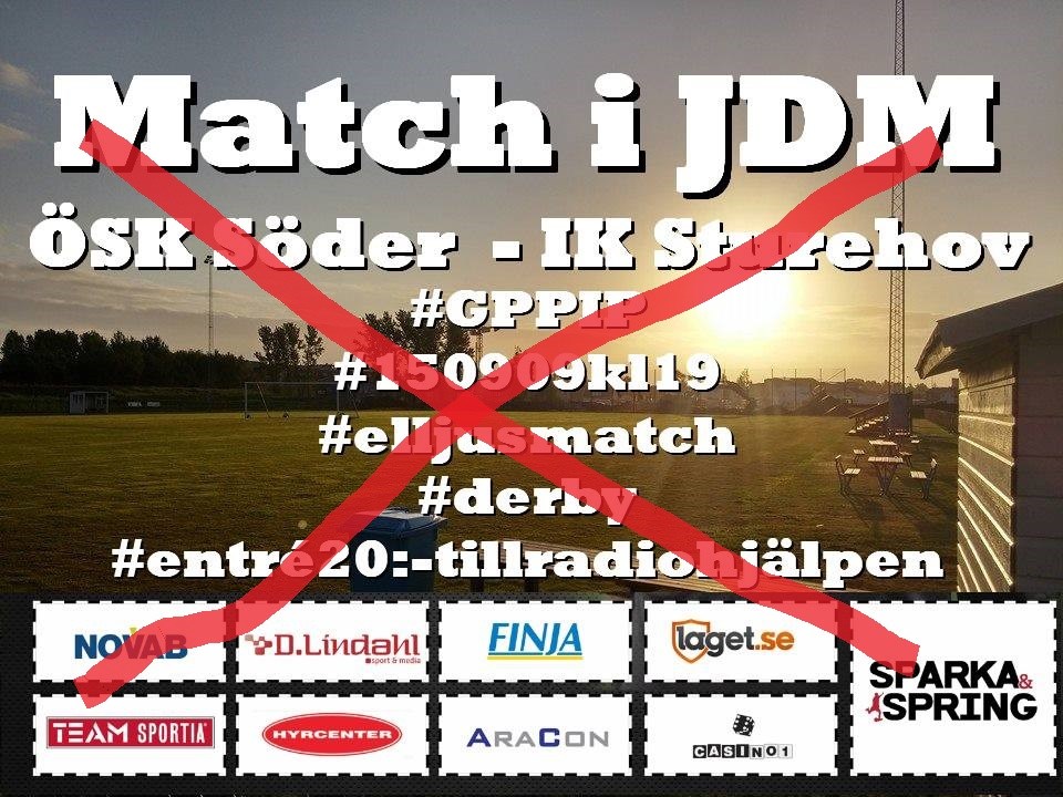 Vi fick precis meddelandet att morgondagens match i JDM inte blir av. IK Sturehov fick tyvärr inte ihop lag på grund av skador och sjukdomar och det är ju så det kan vara ibland på hösten. Tråkigt, men inget att göra något åt. Vi hoppas att Sturehovspelarna snart blir hela och friska igen. Detta innebär alltså att vi vinner matchen med 3-0 och ska spela en "final" mot IFK Hallsberg den 16/9! Eftersom IFK Hallsberg i den första omgången slog IK Sturehov med 4-1 innebär det att det är Hallsberg som har greppet. Det räcker med oavgjort för dom eftersom de har fler gjorda mål än oss. Vi har ju förstås, tekniskt sett inte gjort ett enda! Så vinst mot Hallsberg om en dryg vecka och DM-guldet är bärgat!