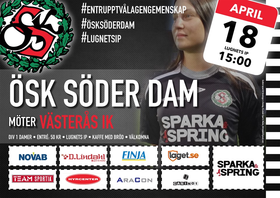 Det är ju inte ofta vi kommer att spela i Örebro under försäsongen men i morgon lördag händer det. På motståndarsidan finns Smedby AIS, ett av de bästa lagen i serien förra året som vi ändå lyckades knipa alla sex poäng av. Ni som var med minns väl matchen borta då det var mer vatten än något annat på plan som vi ändå lyckades vinna med uddamålet! Men nu är det ny säsong och Smedby återfinns i en annan div.1-serie under 2015 då de bl.a. får möte lokalkonkurrenten IFK Norrköping som vi tidigare mött på försäsongen! Till matchen i morgon är det, som vanligt kan vi väl säga, lite bortfall. Mest på grund av skador, sjukdomar och ett högskoleprov, hur man nu kan lägga ett sånt mitt under träningsmatchsäsongen! Men vi kommer med 16 spelare till matchen. Jätteroligt att Marie Ståhlberg gör comeback efter sin mammaledighet, Ida Lindell, östgöte ända ut i toppen på målvaktshandskarna kommer tillbaka efter sjukdom med orden: "Jag missar INTE en match till mot ett "Östgötalag". Vi lånar även in två spelare från ÖSK:s juniorlag, Linnea och Hanna! Övriga spelare ser ni här Välkomna till Lugnets fina matta i morgon vid 16-tiden, köp en kopp kaffe och lägg gärna en "tjuga" i frivillig entré, inget tvång dock! Nu kör vi! #ösksöderdam #försäsong2015
