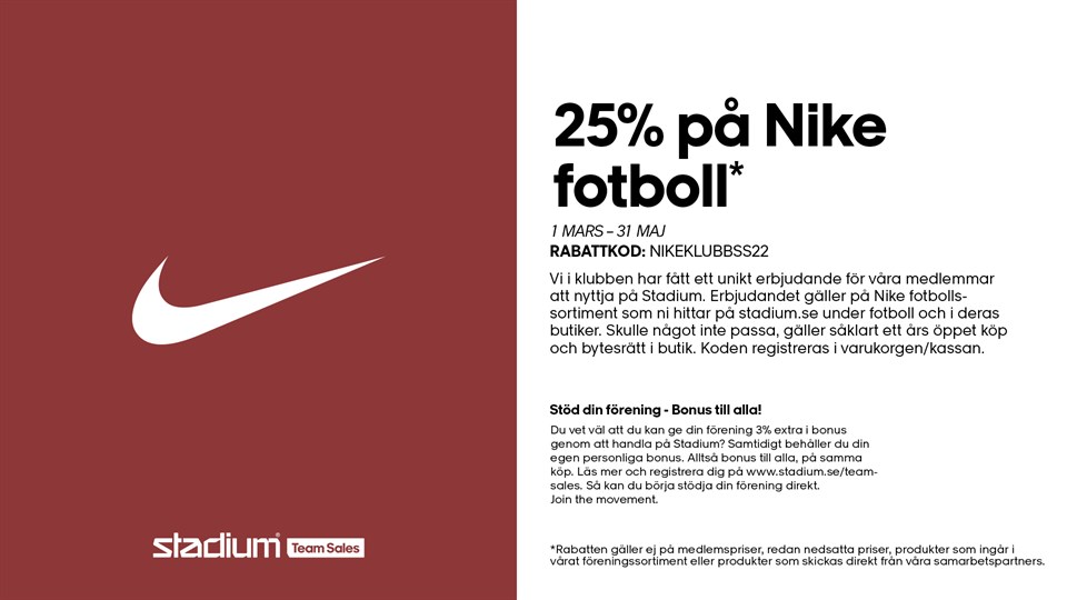 Till alla medlemmar i Solängens BK. Tag del av Erbjudande från Stadium. 25% Rabatt på alla Nike fotbollskor. Mvh Solängens BK