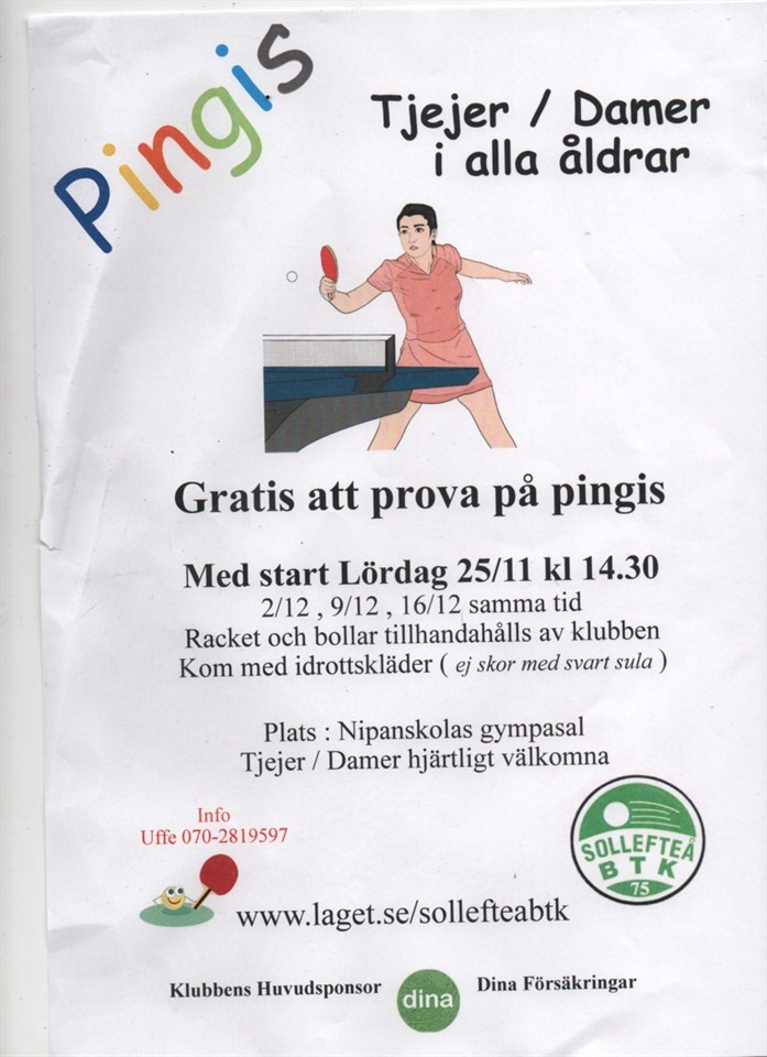 Lördag 25/11 kl 14.30 startar pingis för tjejer/damer i alla åldrar på Nipanskolans gympasal. Gratis att prova på! Racket och bollar tillhandahålls av klubben. Ta med egna idrottskläder. Tacksam om ni inte använder gympaskor med svart sula som kan ge märken på golvet. Hjärtligt välkomna! ____________________________________________________________________________________ Sollefteå Bordtennisklubbs huvudsponsor är Dina Försäkringar Bordtennis 19 nov 2023 0kommentarer