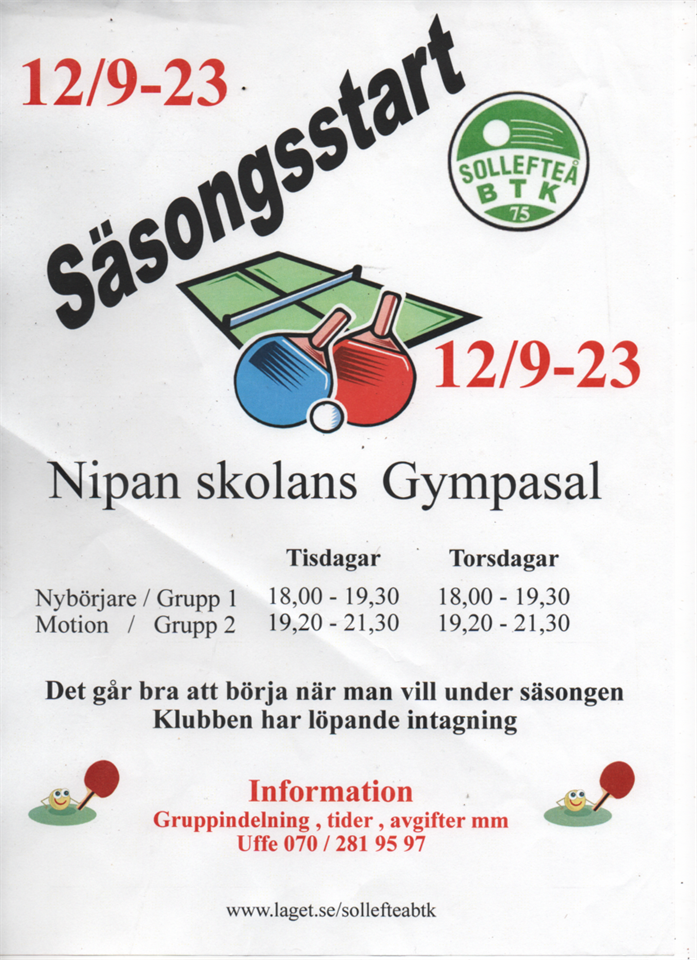 Välkomna på säsongsstart i morgon 12/9 i Nipan skolans gympasal! Nybörjare / Grupp 1. Tisdagar 18.00 - 19.30 och Torsdagar 18.00 - 19.30. Motion / Grupp 2. Tisdagar 19.20 - 21.30 och Torsdagar 19.20 - 21.30. Det går bra att börja när man vill under sässongen och klubben har löpande intagning.