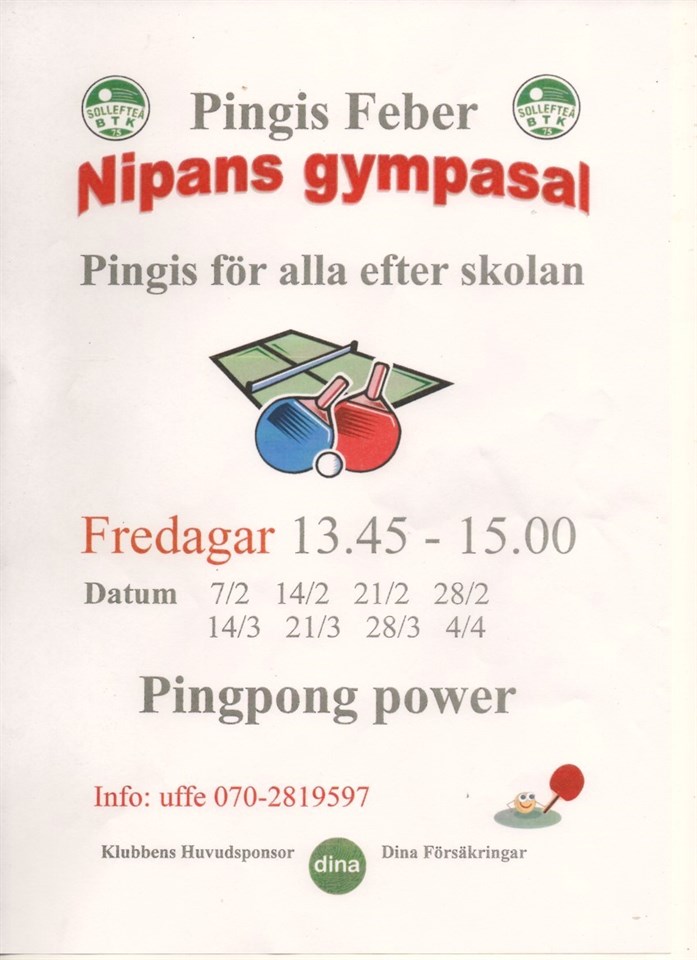 I morgon 13.45 är det premiär för #pingisföralla i Nipanskolans idrottshall. Vi planerar ställer upp några bord och sedan spelar vi valfritt spel. Racketar finns att låna till alla barn och ungdomar som vill testa på pingis. #Pingisfeber #Pingpongpower #svenskabordtennisförbundet. ________________________________________________________________________________ Sollefteå BTK´s huvudsponsor är Dina Försäkringar Bordtennis 6 feb 0kommentarer
