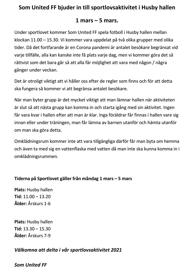 Som United FF bjuder in till sportlovsaktivitet i Husby hallen 1 mars – 5 mars. Under sportlovet kommer Som United FF spela fotboll i Husby hallen mellan klockan 11.00 – 15.30. Vi kommer vara uppdelat på två olika grupper med olika tider. Då det fortfarande är en Corona pandemi är antalet besökare begränsat vid varje tillfälle, alla kan kanske inte få plats varje dag, men vi kommer göra det så rättvist som det bara går så att alla får möjlighet att vara med någon / några gånger under veckan. Det är otroligt viktigt att vi håller oss efter de regler som finns och för att detta ska fungera så kommer vi att begränsa antalet besökare. När man byter grupp är det mycket viktigt att man lämnar hallen när aktiviteten är slut så att nästa grupp kan komma in och starta igång med sin aktivitet. Ingen får vara kvar i hallen efter att man är klar. Inga föräldrar får finnas i hallen vare sig innan eller under träningen, man får lämna av barnen utanför och hämta utanför om man ska göra detta. Omklädningsrum kommer inte att vara tillgängliga därför får man byta om hemma och även ta med sig en vattenflaska med vatten då man inte ska kunna komma in i omklädningsrummen. Tiderna på Sportlovet gäller från måndag 1 mars – 5 mars Plats: Husby hallen Tid: 11.00 – 13.20 Ålder: Årskurs 1-6 Plats: Husby hallen Tid: 13.30 – 15.30 Ålder: Årskurs 7-9 Välkomna att delta i vår sportlovsaktivitet 2021 Som United FF Som United FF 24 feb 2021 1kommentar