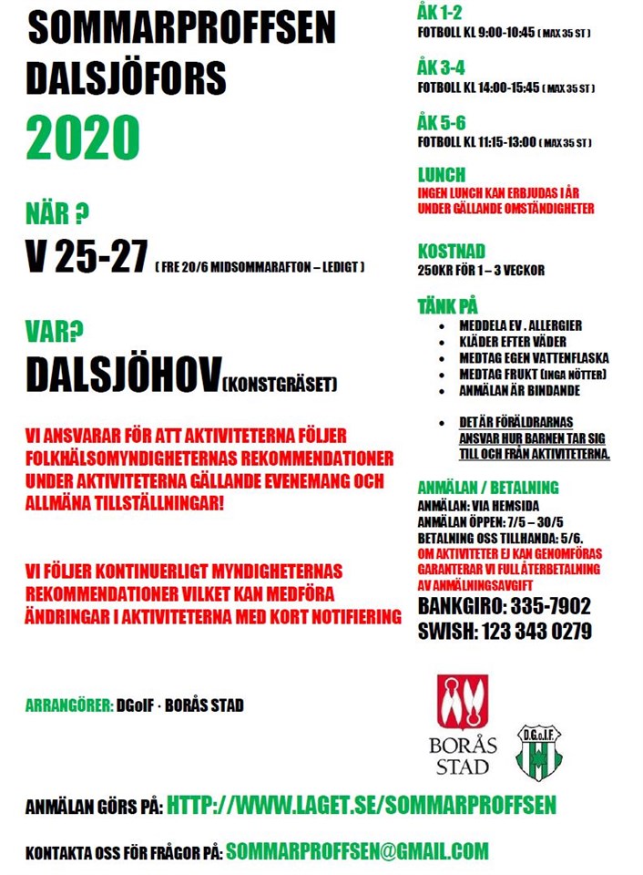 Anmälan till sommarproffsen öppnar nu kl 08:00 och pågår till den 30/5. Aktiviteter kommer att pågå under V25, V26 och V27 med ledigt fredagen den 20/6 (Midsommarafton). Anmälan kan göras via dator, Mobil eller Surfplatta. Anmälan för deltagande i 2020 års upplaga av 'Sommarproffsen Dalsjöfors' görs med hjälp av följande Anmälningsformulär. . För att anmälan skall vara gällade så skall betalning göras till följande bankgirokonto: 335-7902 eller via Swish: 123 343 0279 Betalning oss tillhanda senast 5/6. Beräkning av kostnad för deltagaravgift enlig följande: Deltagaravgift: 250 Kr (Oavsett antal veckor man är anmäld till) Märk betalningen med "Sommarproffsen2020" + barnets namn. Sista anmälningsdag: 30/5 OBS: Anmälan är bindande! Frågor eller ändringar gällande anmälan kan skickas till sommarproffsen@gmail.com. Dalsjöfors GoIF - Borås Stad Sommarproffsen Dalsjöfors 7 maj 2020