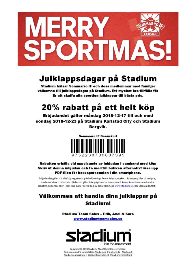 Har ni inte köpt färdigt julklapparna än så rekommenderar Sommarro IF att ni går till Stadium och letar i deras digra sortiment. Där får ni 20% på ett helt köp och pengar går även till Sommarro IF vid köpet med denna kupong. Visa upp denna bild antingen med smartphone eller utskriven på papper. Sommarro IF 19 dec 2018 0kommentarer