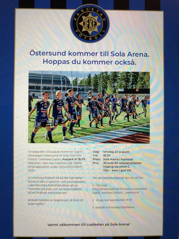 IF Karlstad Fotboll erbjuder alla barn- ungdoms- och juniorspelare i Värmland att komma och kika på sista kvalomgången i Svenska Cupen mellan IF Karlstad Fotboll och superettanlaget Östersunds FK. Bifogat finns inbjudan där det framgår när matchen är, det reducerade priset samt hur man går till väga för att boka biljett. Sommarro IF 18 aug 2023 0kommentarer