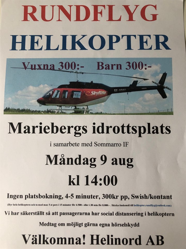 Den 9e augusti kl. 14 kan man åka helikoptertur från Mariebergs IP! Det är Helinord AB som arrangerar, i samarbete med Sommarro IF. Välkomna! Sommarro IF 30 jul 2021 0kommentarer