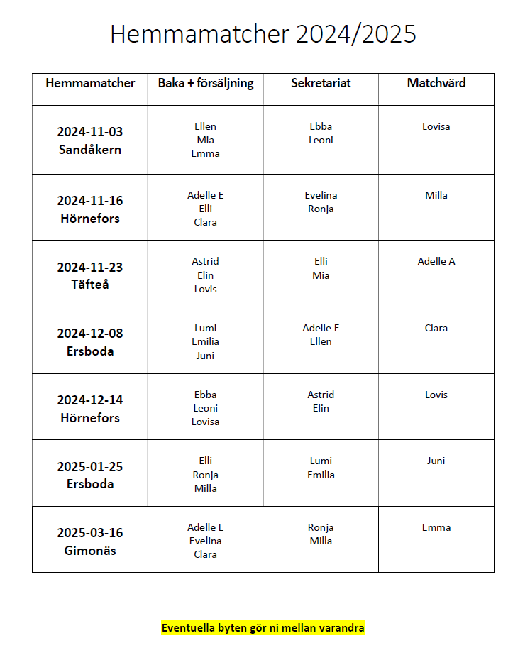 OBS! Schemat har ändrats sedan vi hade vårdnadshavarmötet! Den här bilden ligger även under dokument här på laget som en .pdf fil. Bakning/försäljning: De som är ansvariga för bakning och försäljning ska baka inför matchen samt ansvara för att plocka fram och förbereda, koka kaffe, ansvara för försäljningen, städa undan/diska. Sekretariat: Två sitter i sekretariatet varje match och ansvarar för matchklocka/musik i pauserna. Matchprotokoll ska fyllas i (antal mål, vem som gör mål). Resultatet ska ej visas på resultattavlan, matchprotokollet ska sedan lämnas till tränare som rapporterar till förbundet. Matchvärd: Tar emot och välkomnar motståndarna, visar till omklädningsrum. Håller koll så att det är städat och snyggt i lokalen (läktaren bl.a.). Rally: 3 personer kommer att behöva jobba under Rally VM 13–16 februari. Rallypass ingår till de som arbetar. Mer information om arbetsuppgifter och tider kommer närmare. F-15 IB 28 okt 2024 0kommentarer