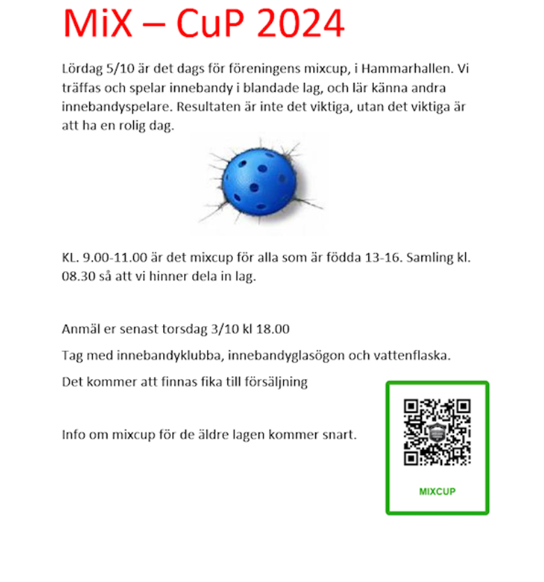 Det är Mix-Cup nu på lördag kl.08:30 - 11:00 i Hammarhallen. Det blir blandade lag och spelas innebandy. Dom som har varit med tidigare år har tyckt det varit skoj. Sista anmälningsdag är torsdag 3/10 kl.18:00. Se info enligt bild. Klicka här för att anmäla er eller kopiera följande länk: https://forms.gle/dQBNeHzPMTgCpogb8 F-15 IB 2 okt 2024 0kommentarer