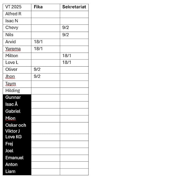 Här kommer ansvarsfördelningen för VT 2025. Det är endast Lag Vit som har hemma-matcher (2 st) den 18/1 och 9/2.