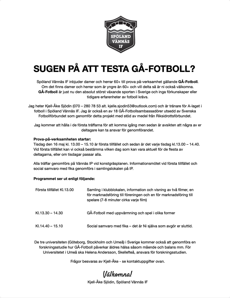 Hej allihopa! Är du 60+ eller har du någon i din närhet som är 60+ som du tror vill testa på Sveriges absolut störst växande sport just nu, GÅ-FOTBOLL? Vi i Spöland Vännäs IF vill vara en förening för alla, gammal som ung och vill därför erbjuda detta som ett fint komplement till våra övriga verksamheter! GÅ-Fotboll är, precis som det låter, en form av fotboll där du endast är tillåten att gå och inga tacklingar är heller tillåtna vilket gör att skaderisken är minimal. GÅ-Fotboll handlar mest om gemenskap och glädje samt att man ska kunna spela fotboll hela livet! Första tillfället är den 16/5 kl. 13 på konstgräsplanen i Vännäs. Då går vi igenom en del info, spelar lite boll och sedan fikar vi tillsammans! 🍪 Fikar efteråt gör vi förövrigt varje gång då det är en viktig del för den sociala aspekten. 😊 Tipsa vidare till de du känner i denna målgrupp och läs mer om sporten här: https://aktiva.svenskfotboll.se/spelare/spela/gafotboll/ Mvh Fotbollssektionen Spöland Vännäs IF 2 maj 2023 0kommentarer