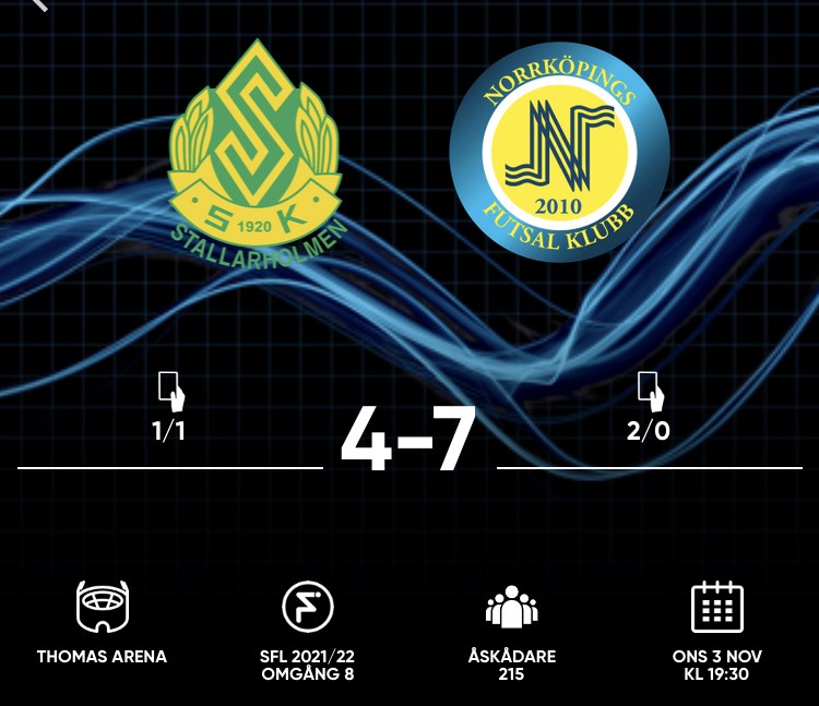 Tv-sänd match i Thomas Arena inför publik och upplagt för futsalfest. Matchen börjar otroligt bra och Adnan Cirak gör sitt första mål denna säsongen i Thomas Arena efter dryga minuten. Sedan utnyttjar vi flera misstag hos bortalaget och går upp till en 3-1 ledning. Sen vänder Norrköping på steken i första halvlek till 3-4, och det tyvärr kändes som att hemmalaget gav gästerna möjligheten att ta kommando i matchen. SSK gör sedan 4-4 och lite hopp tändes och vi ser sedan ett hemmalag som orutinerat tar på sig ett rött kort för snack. Det är aldrig acceptabelt att på det viset få sig själv utvisad. SSK gör en dålig prestation rakt igenom och Norrköping vinner rättvist. Gästerna följer sin matchplan efter deras time out vid 3-1 underläge och får effekten man ville ha. SSK får blicka vidare mot två träningsveckor nu att fortsätta slipa på detaljer och höja lägsta nivån. Det är landslagsuppehåll nu i ligan och man har en bra möjlighet att studsa tillbaka igen och köra på. Viktigt att tänka på är att detta bara är en match av 22 och man kan lära sig mycket av förluster. // SSK