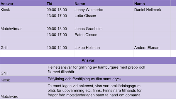 Hej! Har vi någon mer som kan hjälpa till och fylla upp kiosk- och matchvärd schemat för imorgon? Vänligen skicka ett sms till mig: 070-4463311. Tack!