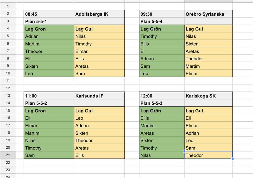 Godmorgon! Här kommer lagindelningen till dagens cup. Vi spelar två halvlekar så grönt lag kommer spela första halvleken och gult lag andra. Det är olika lag i varje match så det blir lite rotation idag PF16 7 okt 2023 0kommentarer