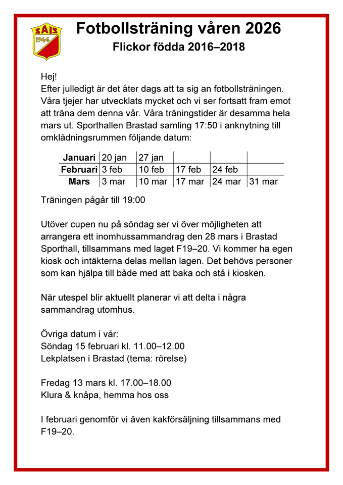 | Träning Lekplats | 15 feb, 11:30 |
