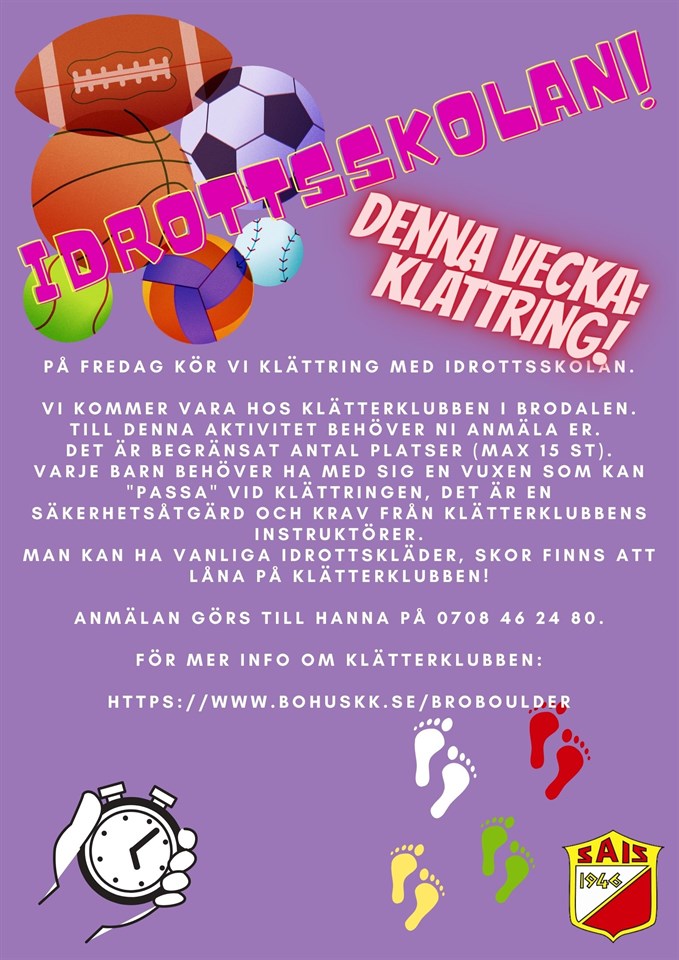 Här kommer information om fredagens Idrottsskola! På fredag kör vi klättring med Idrottsskolan. Vi kommer vara hos klätterklubben i Brodalen. Till denna aktivitet behöver ni anmäla er. Det är begränsat antal platser (max 15 st). Varje barn behöver ha med sig en vuxen som kan "passa" vid klättringen, det är en säkerhetsåtgärd och krav från klätterklubbens instruktörer. Anmälan görs till Hanna på 0708 46 24 80. För mer info om klätterklubben så kolla nedanstående länk https://www.bohuskk.se/BROBOULDER Idrottsskolan 22 nov 2022 0kommentarer