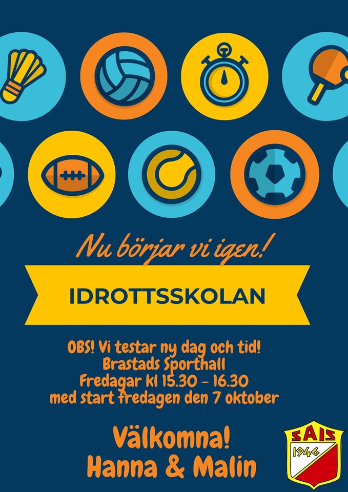 Hej! Nu startar vi upp Idrottsskolan igen! Vi testar ny dag och tid! Vi börjar fredagen den 7 oktober kl 15.30 och kommer köra på fredagar 15.30 - 16.30 under hösten! Varmt välkomna! Hanna och Malin Idrottsskolan 28 sep 2022 1kommentar